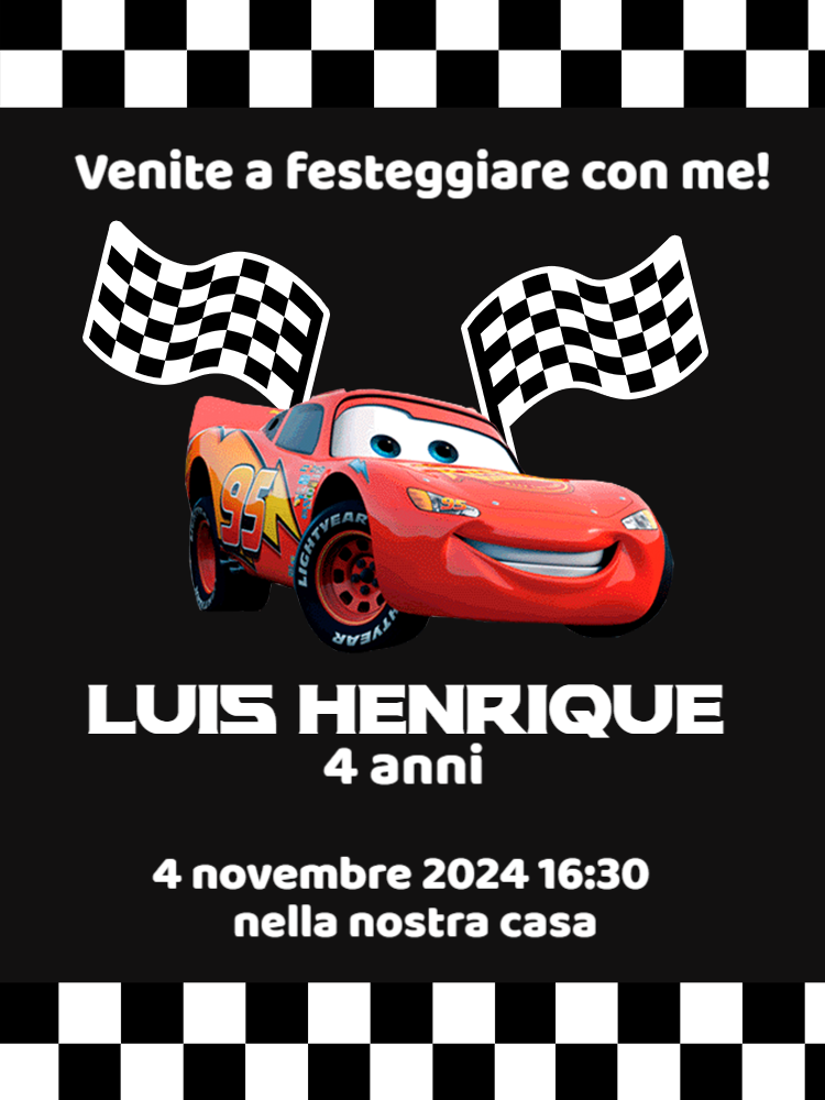 Sfreccia verso la festa con questo invito digitale ispirato al film Cars, perfetto per un compleanno pieno di energia e divertimento! Personalizza online in pochi minuti e scarica subito, con un design vivace in nero e rosso, bandiere a scacchi e la famosa macchina rossa amata dai bambini. Un invito moderno, allegro e ideale per trasformare la festa in una vera gara di emozioni. invito digitale cars, invito compleanno cars