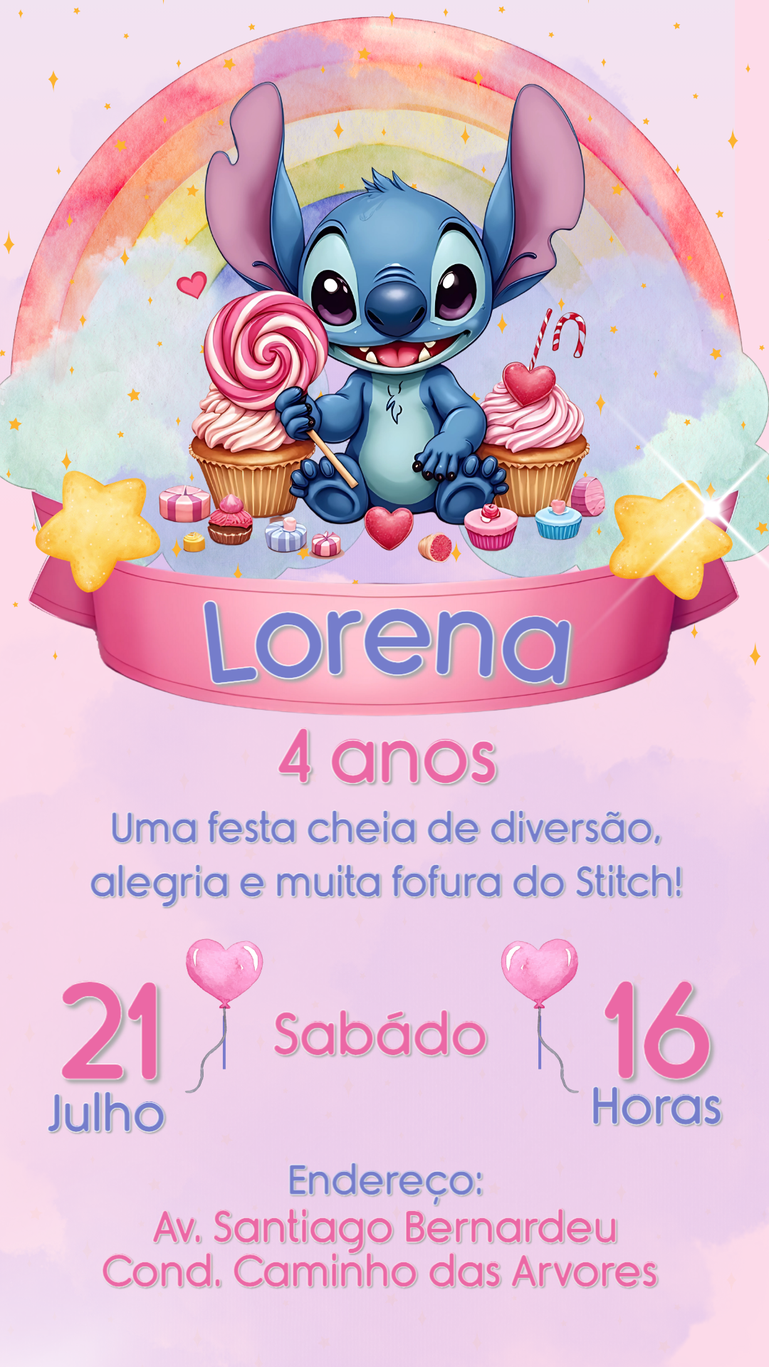 Convite de Aniversário Stitch Rosa para Editar Online
