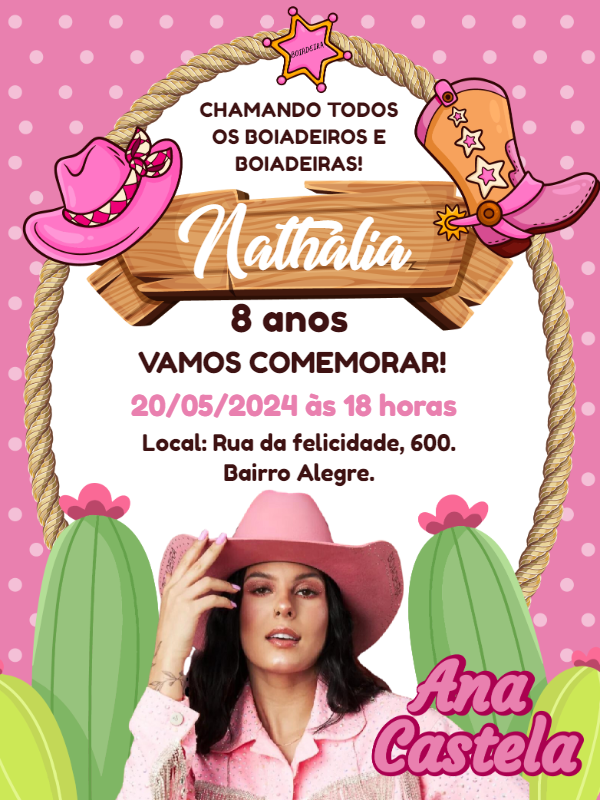 Chame toda a galera para uma festa no estilo Boiadeira com este convite incrível da Ana Castela! Com um design country super charmoso em tons de rosa, com botas, chapéus e cactos, é a escolha perfeita para um aniversário inesquecível. Personalize você mesmo em minutos! Edite facilmente online, inserindo o nome da aniversariante, idade, data, hora e o local da comemoração. Assim que terminar, o download é liberado na hora. Ideal para compartilhar online com seus convidados ou para imprimir. Crie agora e prepare-se para a festa