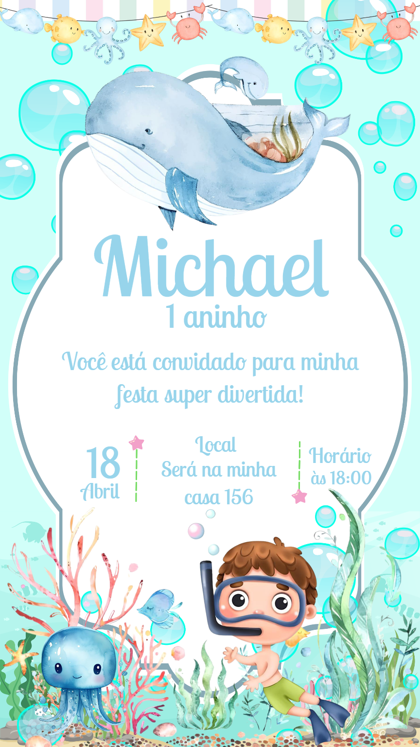 Crie um convite encantador com tema oceano, com baleia e menino mergulhador. Personalize online em minutos e envie para seus convidados!