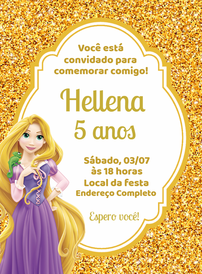 Surpreenda seus convidados com este lindo convite da Rapunzel. Personalize com seus dados em minutos e compartilhe pela internet de forma rápida e fácil.