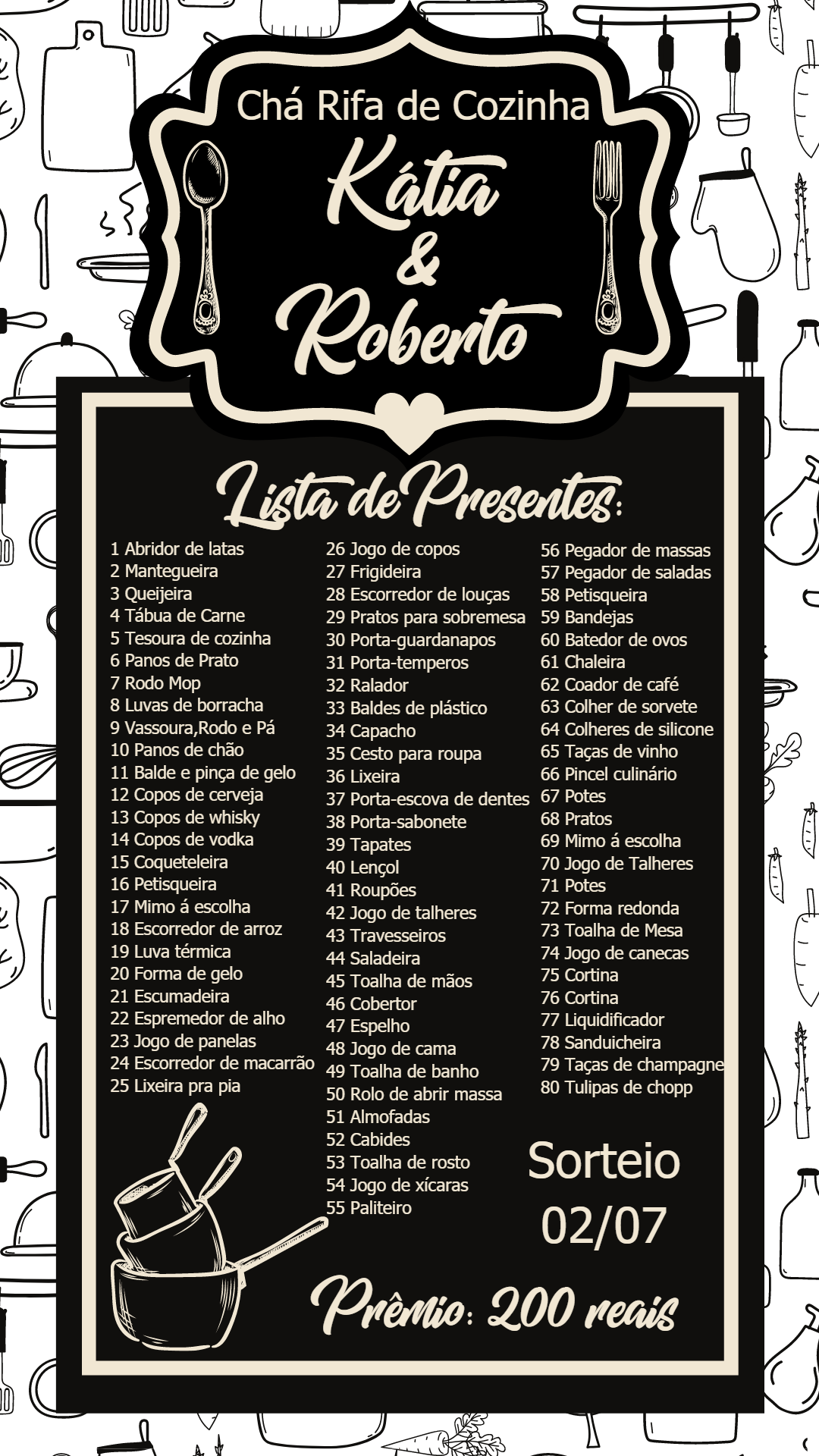 Organize seu Chá Rifa de Cozinha com um convite charmoso e prático! Com um design elegante estilo lousa e ilustrações de utensílios de cozinha, este modelo é a escolha perfeita para o seu evento. Personalize online em minutos: edite facilmente os nomes, a lista completa de presentes, a data do sorteio e o valor do prêmio. É simples e rápido! Após a edição, seu convite fica pronto para download imediato. Ideal para compartilhar nas redes sociais, enviar pela internet ou imprimir para surpreender seus convidados. Crie agora e torne seu chá de cozinha inesquecível