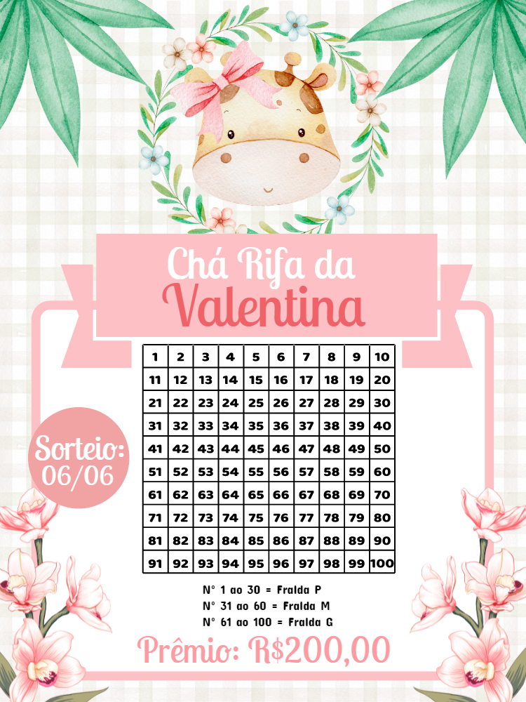 Celebre a chegada da sua pequena com o nosso adorável Convite Chá Rifa Girafinha, um design que irradia doçura e alegria, ideal para um chá de bebê festivo e inesquecível. Este template digital encantador, com sua girafinha meiga e detalhes florais em aquarela, oferece a solução perfeita para organizar seu chá de fraldas de forma prática e charmosa, incluindo uma tabela completa de 1 a 100 para sorteio, especificações para fraldas P, M e G, e espaços para o prêmio de R$200,00 e a data do sorteio, tudo facilmente personalizável para a sua Valentina. Mais do que um simples convite, ele se torna uma lembrança afetiva que facilita a arrecadação de fraldas, enquanto convida seus entes queridos a participarem