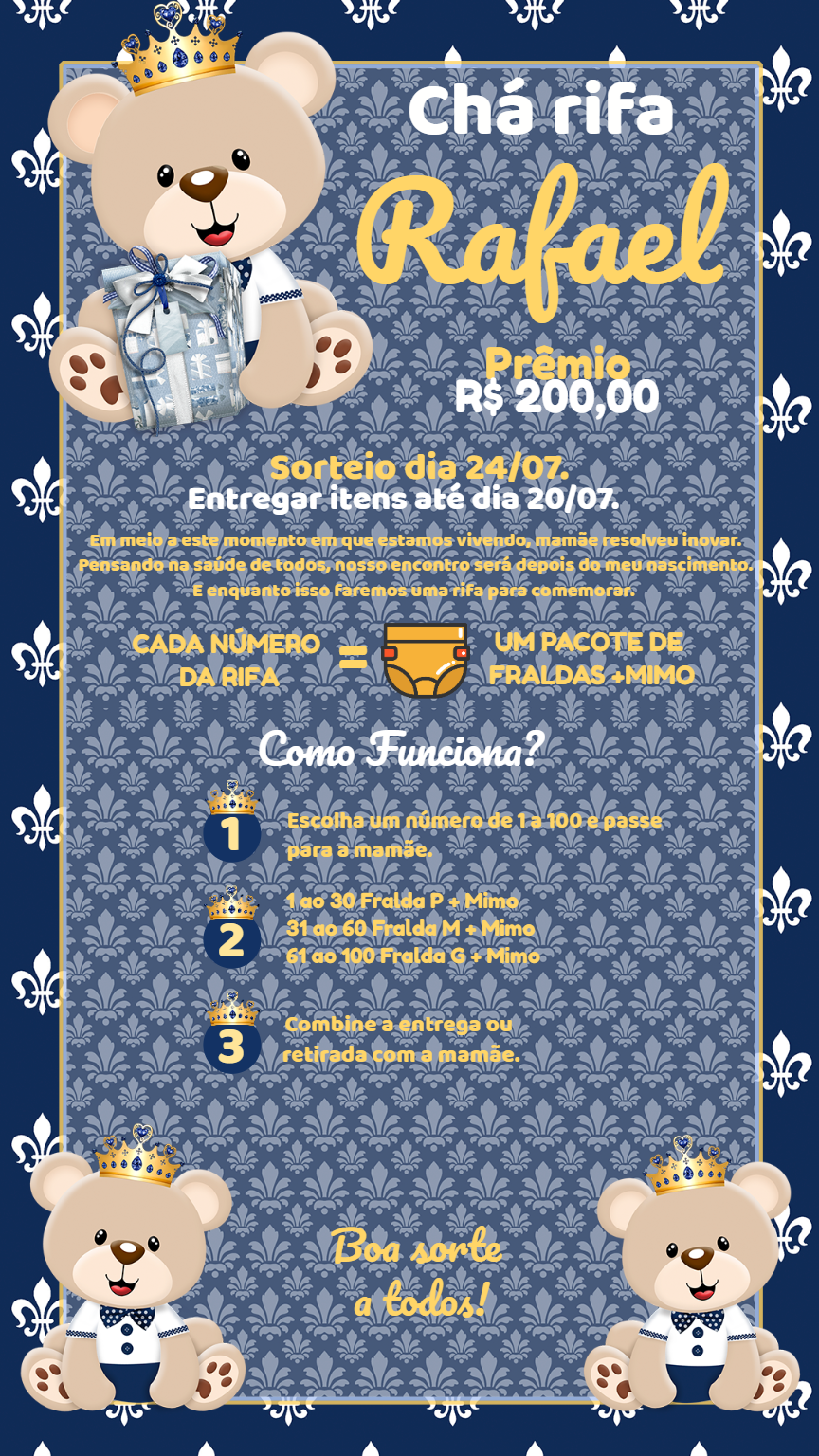 Crie seu convite de chá rifa com o tema Ursinho Príncipe! Edite online em minutos e compartilhe com todos pelas redes sociais.