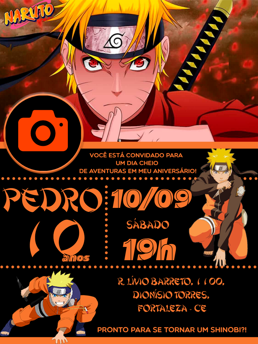 Transforme o aniversário do seu filho em uma missão ninja com este convite do Naruto! Com um design incrível e espaço para foto, você cria um convite único e cheio de energia. Personalize online em poucos cliques: adicione o nome do aniversariante, idade, data, horário e local da festa. É super fácil e rápido! Após editar, o download é instantâneo. Perfeito para compartilhar nas redes sociais, enviar por aplicativos de mensagens ou imprimir. Convide todos para uma celebração inesquecível e cheia de aventura