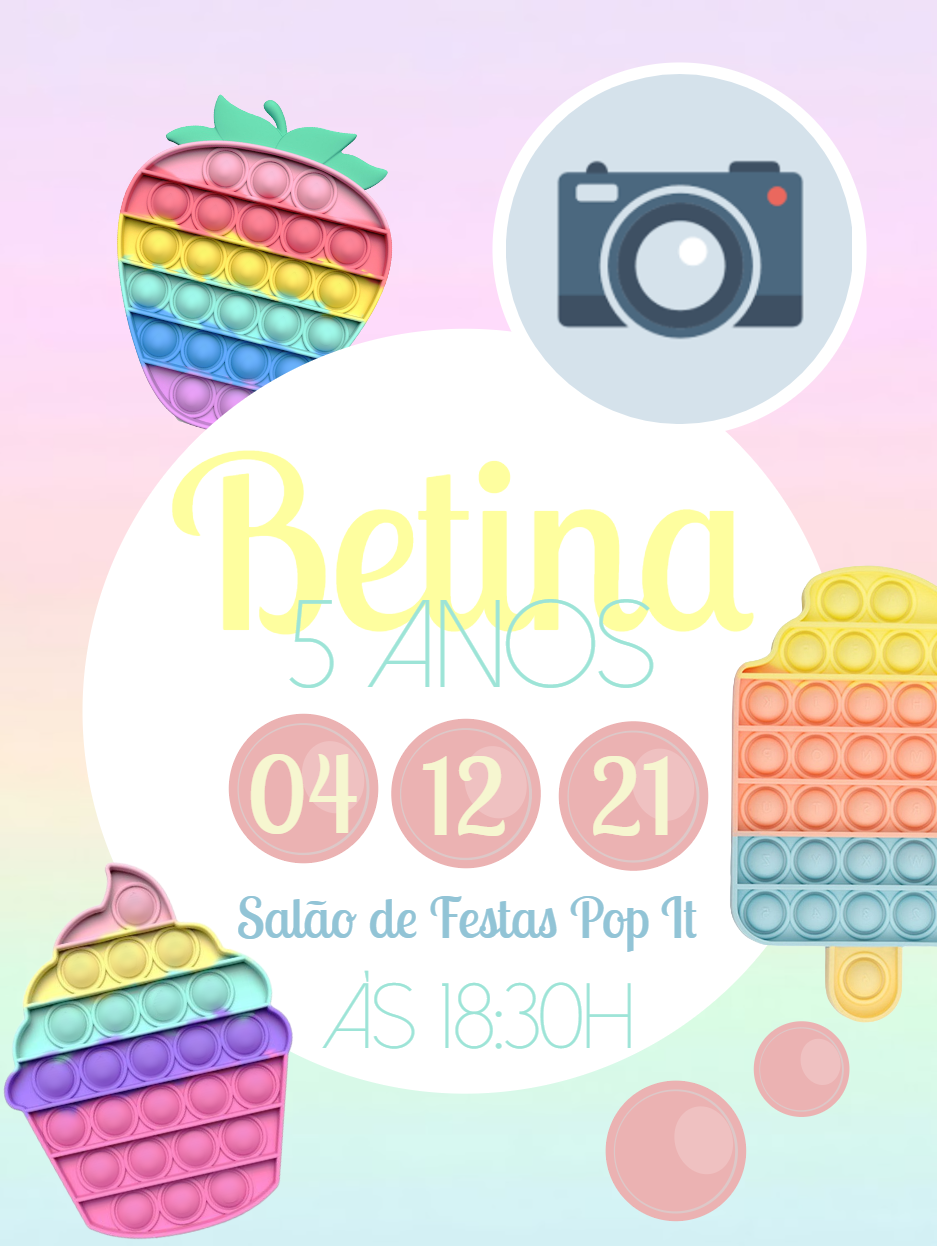 Prepare-se para a festa mais divertida do ano com este convite de aniversário com o tema Pop It Fidget Toys! Com um design super colorido em tons pastel e ilustrações dos brinquedos que são uma febre, este convite é a escolha perfeita para uma celebração cheia de alegria. O grande diferencial é o espaço para adicionar uma foto, tornando o convite ainda mais pessoal e especial! Edite online de forma rápida e fácil: insira o nome e a idade do(a) aniversariante, a data, o horário e o local da comemoração. Em poucos minutos, seu convite personalizado está pronto! Faça o download imediato e compartilhe digitalmente com seus convidados ou imprima para uma entrega tradicional. Crie um convite único e surpreenda a todos