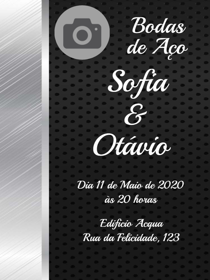 Celebre 11 anos de amor e união com o nosso deslumbrante Convite Digital Bodas de Aço com foto, um template que exala uma elegância moderna e uma sofisticação inigualável, perfeito para marcar essa etapa tão significativa na jornada do casal. Este design exclusivo, com seu fundo preto pontilhado sutil e a faixa lateral metálica prateada, cria um contraste chique que é acentuado pela caligrafia clássica e pela possibilidade de adicionar uma foto personalizada do casal, tornando cada convite verdadeiramente único e profundamente íntimo. Ideal para casais como Sofia e Otávio que buscam um convite memorável e fácil de compartilhar, este template de Bodas de Aço é a escolha perfeita para anunciar sua celebração de forma distinta e inesquecível, garantindo que cada convidado sinta a alegria e o carinho dessa ocasião especial.