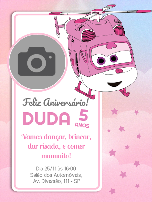 Prepare-se para uma festa inesquecível com o nosso encantador Convite de Aniversário Super Wings com foto, perfeito para celebrar os 5 anos da sua pequena com muita alegria e aventura! Este template vibrante e divertido, protagonizado pela adorável helicóptero rosa Dizzy, do universo Super Wings, é ideal para convidar todos os amiguinhos para um dia repleto de dança, brincadeiras e muitas risadas, garantindo que a personalidade da aniversariante brilhe com o espaço exclusivo para uma foto especial. Com um design delicado em tons de rosa e azul, adornado com estrelas cintilantes, este convite transmite um sentimento de pura magia e celebração, sendo a escolha perfeita para festas infantis que buscam um toque lúdico e memorável, convidando a todos para "comer muuuuito" e criar memórias preciosas.