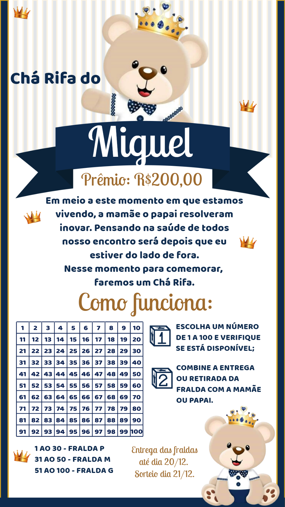 Organize um Chá Rifa inesquecível para celebrar a chegada do seu pequeno! Este convite com o tema Ursinho Príncipe é a escolha perfeita, combinando fofura e elegância em tons de azul e dourado. Personalize você mesmo, de forma rápida e fácil! Altere o nome do bebê, o valor do prêmio, as regras da rifa, as datas e toda a mensagem para seus convidados. A edição é feita online, sem precisar de nenhum programa. Após finalizar, baixe o arquivo em alta qualidade na hora! Perfeito para enviar pela internet, compartilhar nas redes sociais ou imprimir. Crie um convite único e organize seu evento com muito mais praticidade e estilo.