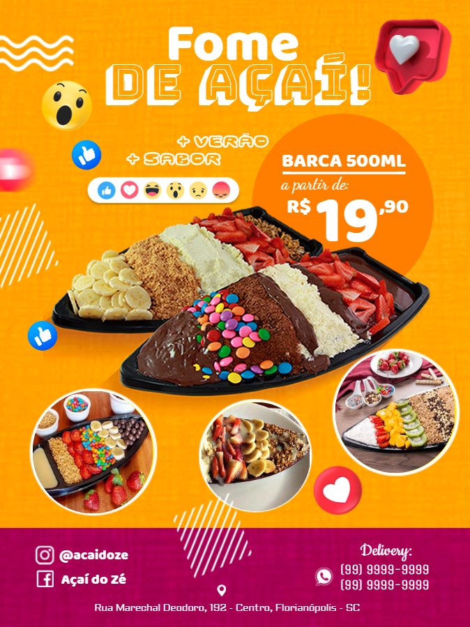 Aumente suas vendas! Personalize este folheto de açaí com suas ofertas e fotos. Ideal para delivery, redes sociais e divulgação local.