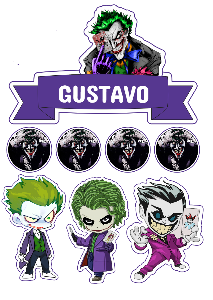 Crie um topo de bolo incrível do Coringa! Edite o nome online e imprima em casa para uma decoração de festa única e cheia de personalidade.