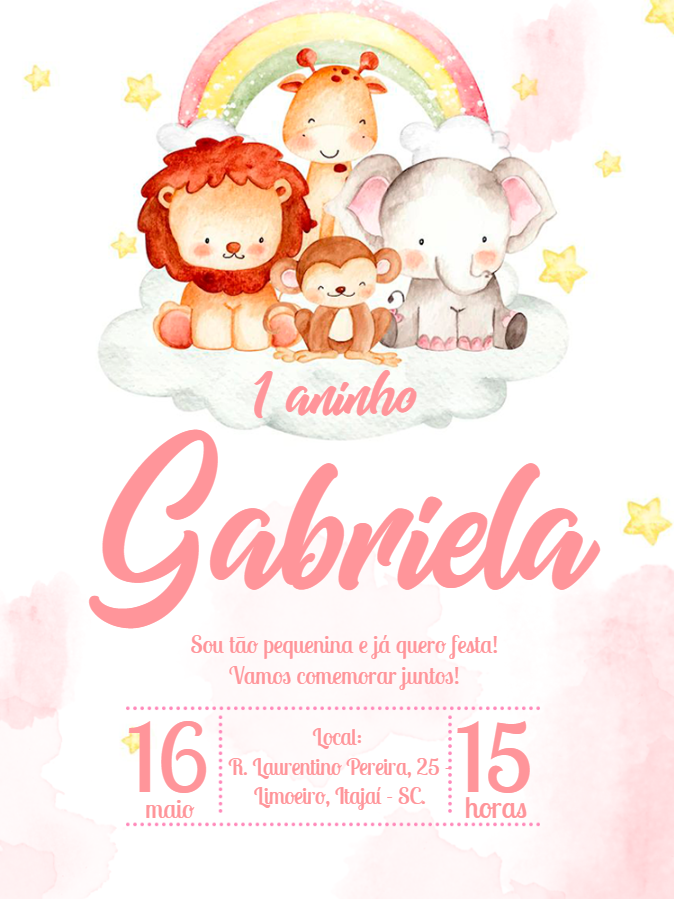 Celebre com doçura e aventura! Este convite de aniversário com tema safari aquarela é perfeito para uma festa inesquecível. Com ilustrações delicadas de um leão, girafa, elefante e macaco sob um lindo arco-íris, o design em tons pastel é puro encanto. Crie um convite único em minutos! Edite online de forma fácil e rápida, personalizando com o nome do(a) aniversariante, a idade, a data, o horário e o local da comemoração. Após finalizar a edição, seu convite fica pronto para download imediato. É ideal para enviar pelas redes sociais, por aplicativos de mensagens ou para imprimir e entregar em mãos. Surpreenda seus convidados com este convite adorável e comece a festejar
