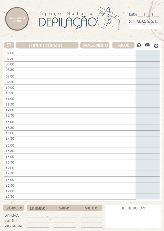 Organize seus atendimentos de depilação com estilo e profissionalismo! Esta folha de agendamento editável possui um design clean e elegante, perfeita para esteticistas e espaços de beleza que buscam otimizar a gestão diária. Controle seus horários, clientes, procedimentos e o fluxo de caixa de forma prática e visual. Personalize tudo online em instantes: insira sua logo e preencha as informações do seu negócio. É muito fácil! Após a edição, baixe o arquivo imediatamente para imprimir ou usar em seus dispositivos digitais. Otimize sua rotina e transmita mais profissionalismo aos seus clientes com uma agenda impecável e personalizada