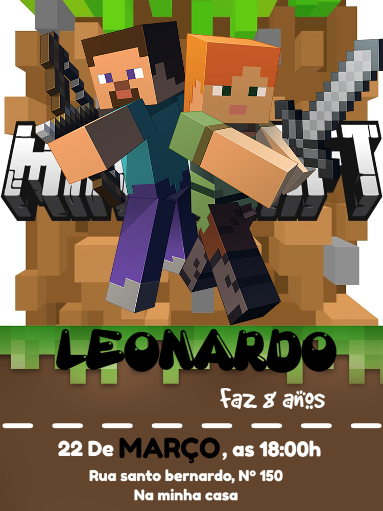 Convite de Aniversário Minecraft com Steve e Alex para Editar