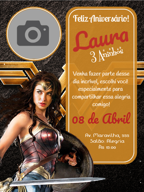 Celebre com a força da Mulher Maravilha! Crie um convite de aniversário personalizado com foto, edite online e envie para todos os seus convidados.