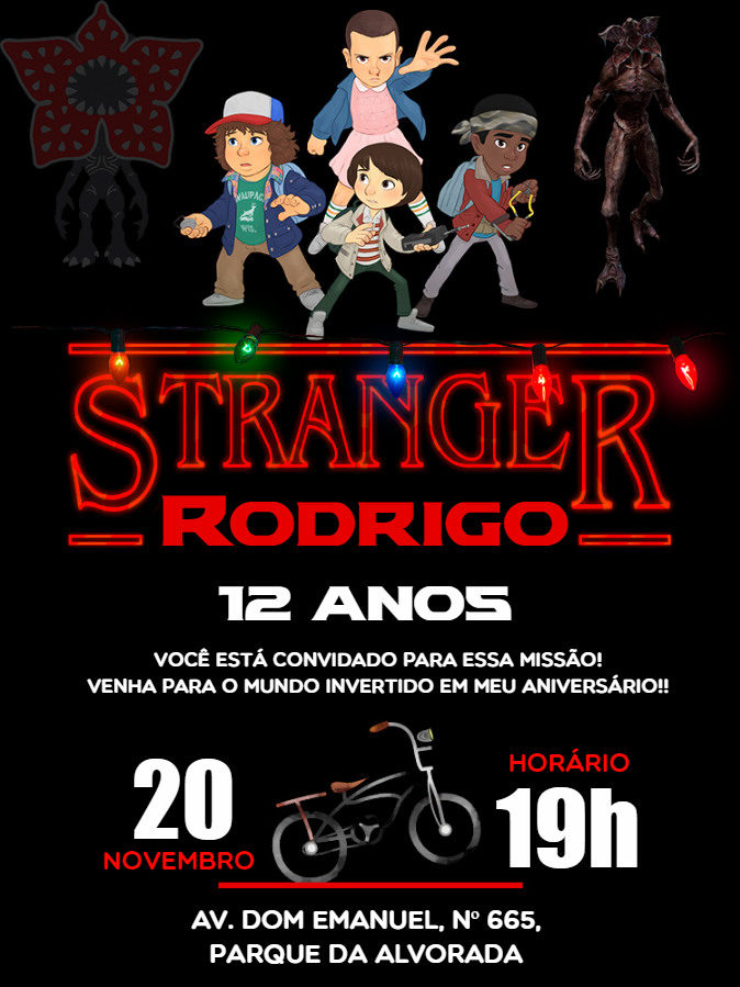 Prepare-se para uma aventura épica no Mundo Invertido com nosso exclusivo Convite de Aniversário Stranger Things, perfeito para celebrar os 12 anos do Rodrigo ou qualquer fã da série! Este design vibrante e misterioso, com os icônicos personagens como Eleven, Mike, Dustin e Lucas, além dos aterrorizantes Demogorgons e a clássica bicicleta, transmite um sentimento de pura diversão e emoção, convidando seus amigos para uma missão inesquecível. Ideal para festas temáticas que buscam mergulhar os convidados na atmosfera única de Hawkins, este convite detalhado e otimizado para SEO garante que seu evento seja um sucesso estrondoso, prometendo uma celebração cheia de mistérios e alegrias. Não perca a chance de transformar o aniversário em uma experiência verdadeiramente "estranha" e memorável, onde cada detalhe evoca a magia e o suspense da sua série favorita.