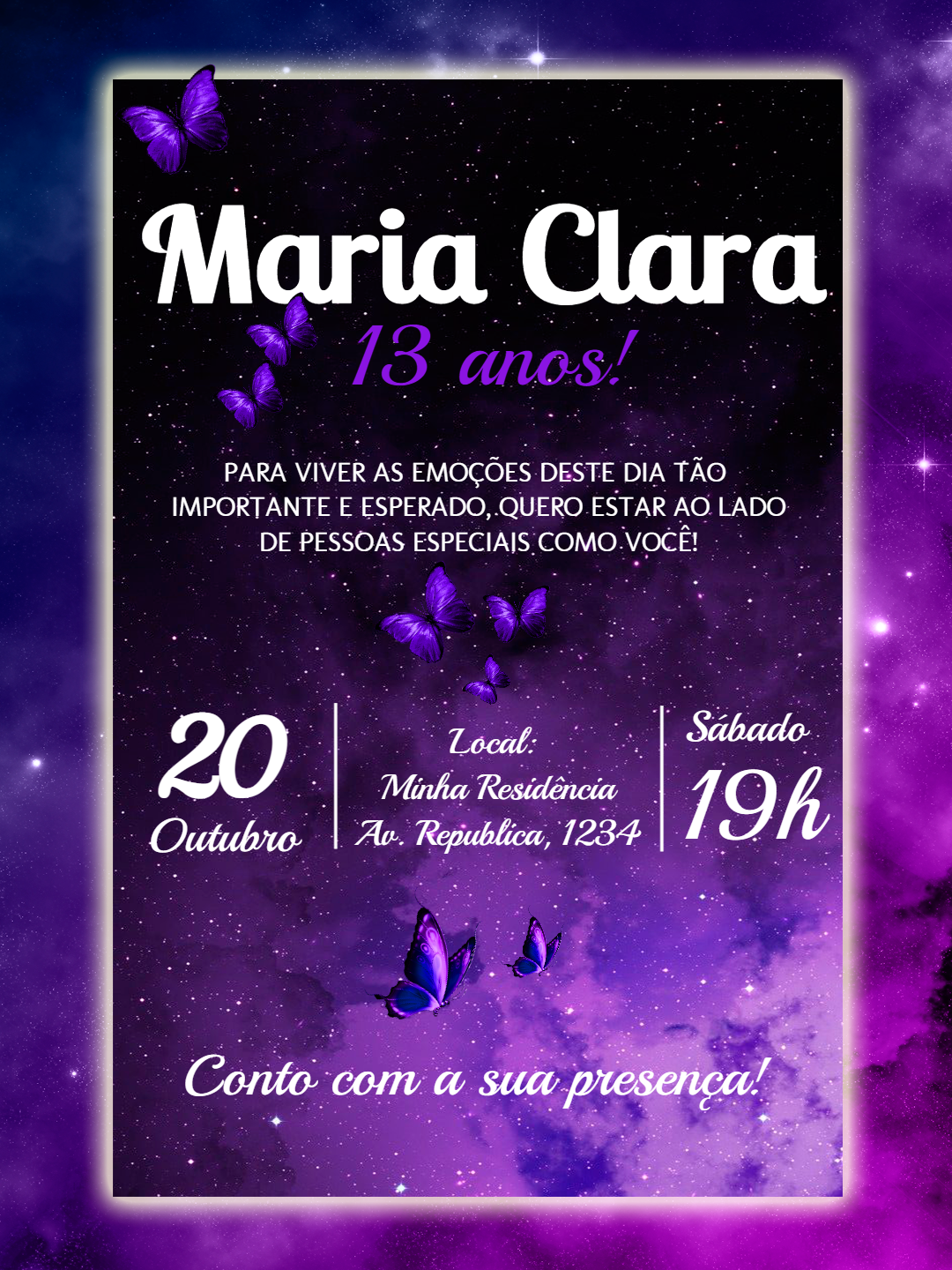 Celebre um momento mágico com este convite de aniversário com tema galáxia! O design deslumbrante em tons de roxo, com um céu estrelado e borboletas vibrantes, cria uma atmosfera mística e sonhadora, perfeita para uma festa inesquecível. Personalize este modelo online de forma rápida e intuitiva. Altere o nome, a idade, a data, o horário e o endereço da festa com apenas alguns cliques. Deixe o convite com a sua cara, editando todas as informações de texto. Após finalizar, baixe seu convite instantaneamente em alta resolução. Ideal para imprimir ou enviar pela internet para todos os seus convidados. Crie uma expectativa incrível para o seu grande dia