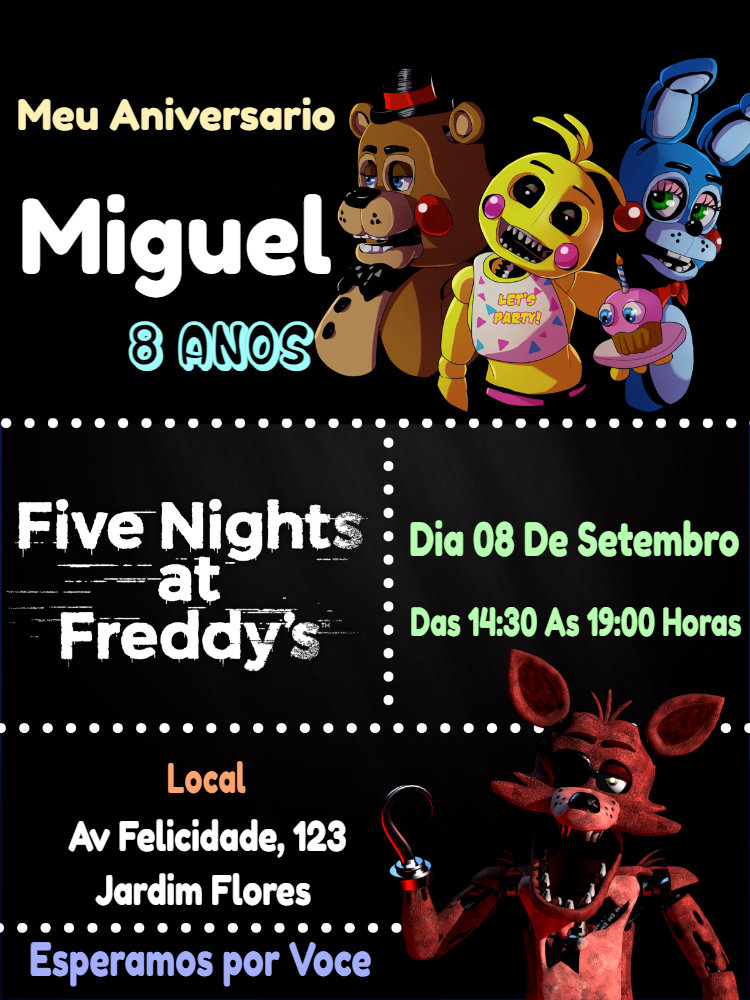 Crie um convite de aniversário assustadoramente divertido com Freddy, Foxy e toda a turma! Edite online em minutos e envie para seus convidados.