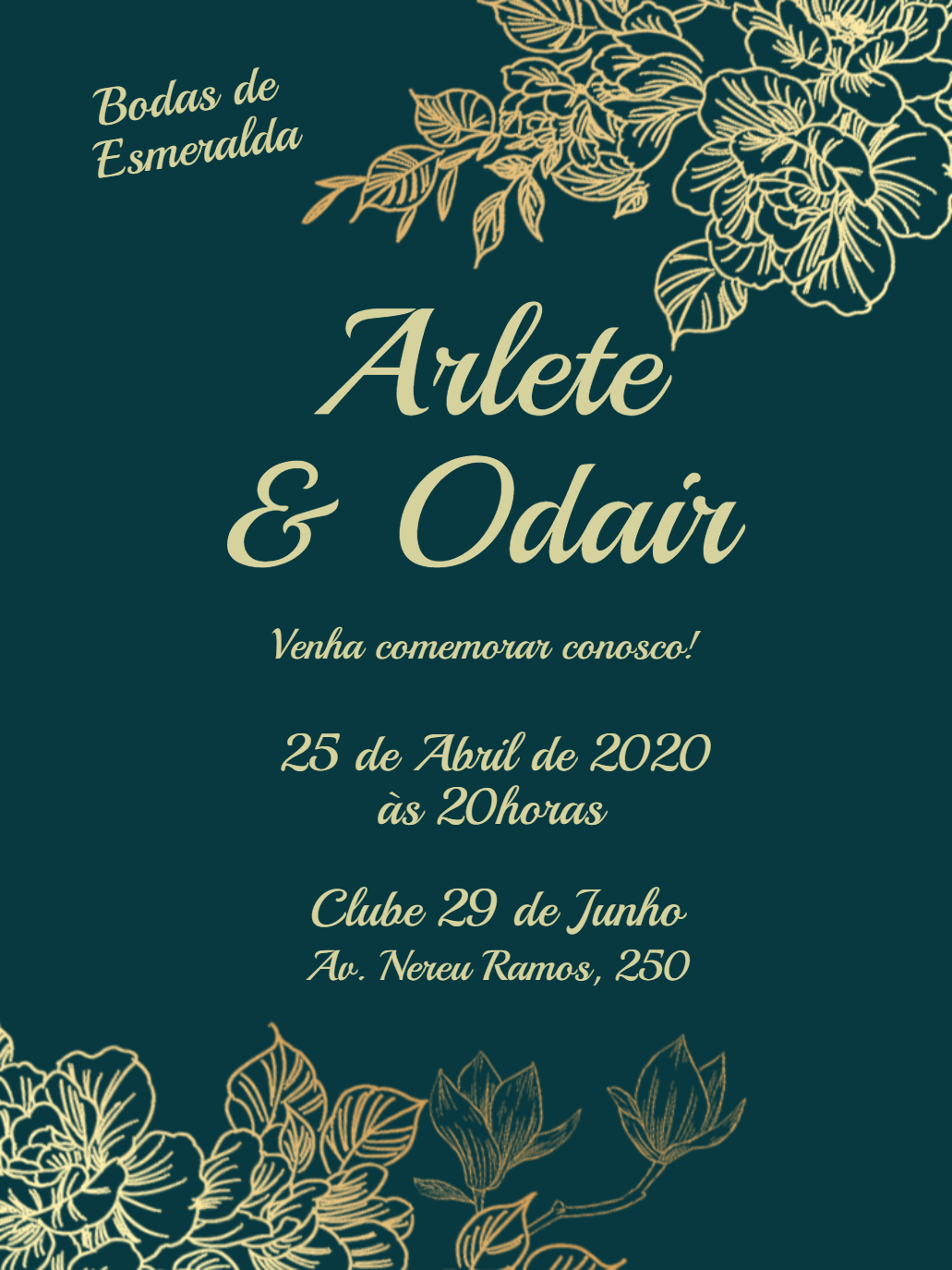 Celebre quarenta anos de amor e união com nosso deslumbrante Convite de Bodas de Rubi, um template que exala sofisticação e um charme atemporal, perfeito para marcar essa jornada especial com a elegância que ela merece. Com um fundo em tom de verde-esmeralda profundo e detalhes florais dourados ricamente ilustrados, este convite digital transmite uma distinção inquestionável, convidando seus entes queridos a partilhar de um momento festivo e memorável. Ideal para casais que buscam um design exclusivo e personalizável para suas Bodas de Rubi, ele oferece a flexibilidade de adicionar nomes, data, horário e local do evento com facilidade, garantindo que cada detalhe reflita a grandiosidade da celebração. Permita que a beleza e a distinção deste convite preparem o cenário para uma festa inesquecível, onde cada convidado sentirá a emoção e a alegria de celebrar um marco tão significativo na história de vocês.