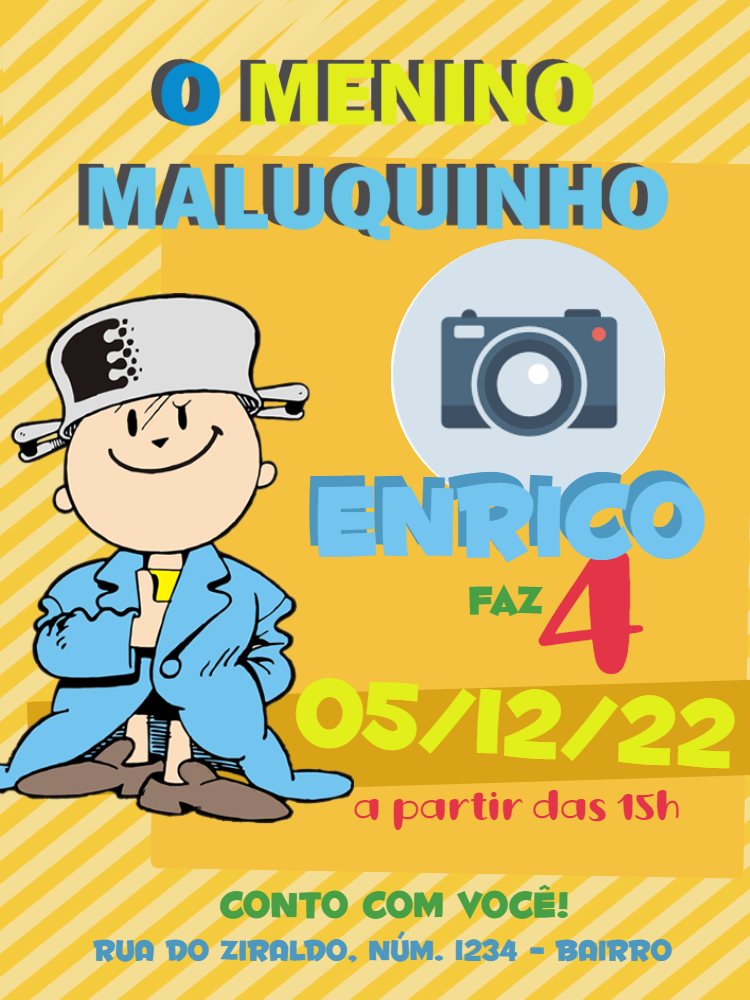Prepare uma festa cheia de alegria e travessuras com este convite de aniversário do Menino Maluquinho! Com um design vibrante e o personagem mais amado dos quadrinhos, este modelo é perfeito para celebrar um dia especial. O grande destaque é o espaço para você adicionar a foto do aniversariante, tornando a chamada para a festa única e pessoal. Personalize online de forma rápida e intuitiva! Altere o nome, a idade, a data, o horário e o endereço da comemoração em poucos minutos. Assim que terminar, seu convite estará pronto para download imediato. Ideal para compartilhar nas redes sociais, enviar pela internet para amigos e familiares ou imprimir em alta qualidade. Crie agora e convide todos para essa grande aventura
