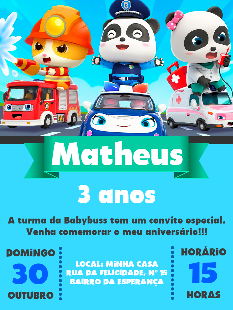 Crie um convite personalizado com os adoráveis personagens do Babybus. Edite em minutos pelo celular ou computador e envie para seus convidados!