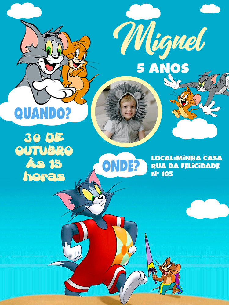 Celebre com um convite divertido de Tom e Jerry na praia. Personalize com a foto da criança e envie para todos os convidados pela internet.