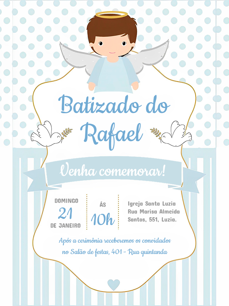 Celebre o batizado do seu anjinho com um convite encantador e delicado. Com um design celestial em tons de azul, este modelo traz a figura de um anjinho fofo, pombas da paz e detalhes dourados, criando uma atmosfera serena e especial para este momento sagrado. Personalize online de forma rápida e fácil! Adicione o nome da criança, a data, o horário e o local da cerimônia e da recepção. Após editar, baixe seu convite em alta resolução na hora. Perfeito para enviar aos seus convidados pelas redes sociais, por e-mail ou para imprimir e entregar em mãos. Crie uma recordação inesquecível deste dia abençoado