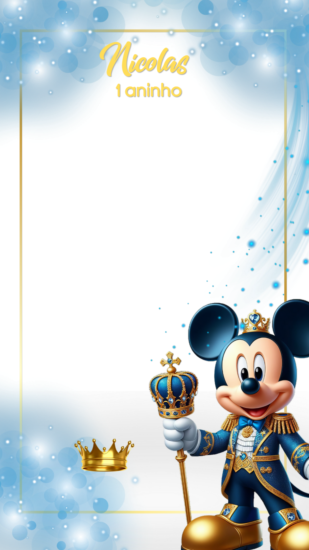 Crie uma moldura de aniversário personalizada com o tema Mickey Realeza. Edite online de forma fácil e rápida para suas fotos e stories.