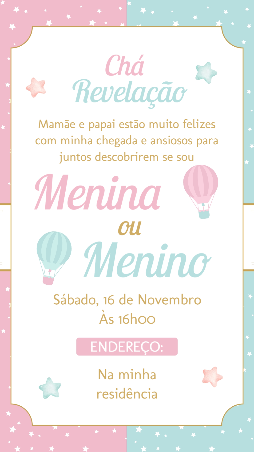 Celebre a doce espera com este encantador convite para Chá Revelação! Com um design delicado em tons de rosa e azul, decorado com estrelas e balões, ele é perfeito para criar o clima de suspense e alegria para a grande descoberta. Personalize online em minutos: adicione facilmente a data, o horário e o local da sua festa. Após editar, o download é imediato! Você pode enviar seu convite digitalmente para todos os convidados pelas redes sociais e aplicativos de mensagem ou, se preferir, imprimir em alta qualidade. Crie um momento inesquecível desde o primeiro anúncio. É rápido, prático e ideal para a sua celebração