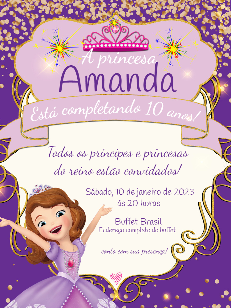 Celebre um aniversário real com um convite mágico da Princesa Sofia! Com um design encantador em tons de lilás e detalhes em dourado brilhante, este convite é perfeito para uma festa de princesa inesquecível. Personalize você mesmo online em poucos minutos! É muito fácil: edite o nome da aniversariante, a idade, a data, o horário e o local da festa diretamente no nosso site. A edição é simples e rápida, permitindo que você crie um convite único. Após personalizar, baixe seu convite em alta qualidade na hora! Ideal para enviar pelas redes sociais, compartilhar com amigos e familiares pela internet ou até mesmo para imprimir e entregar em mãos. Crie agora e encante seus convidados com a magia da Princesa Sofia