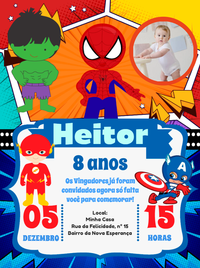 Crie um convite de aniversário dos Vingadores personalizado com a foto do seu filho! Edite online em minutos e envie para todos os convidados.