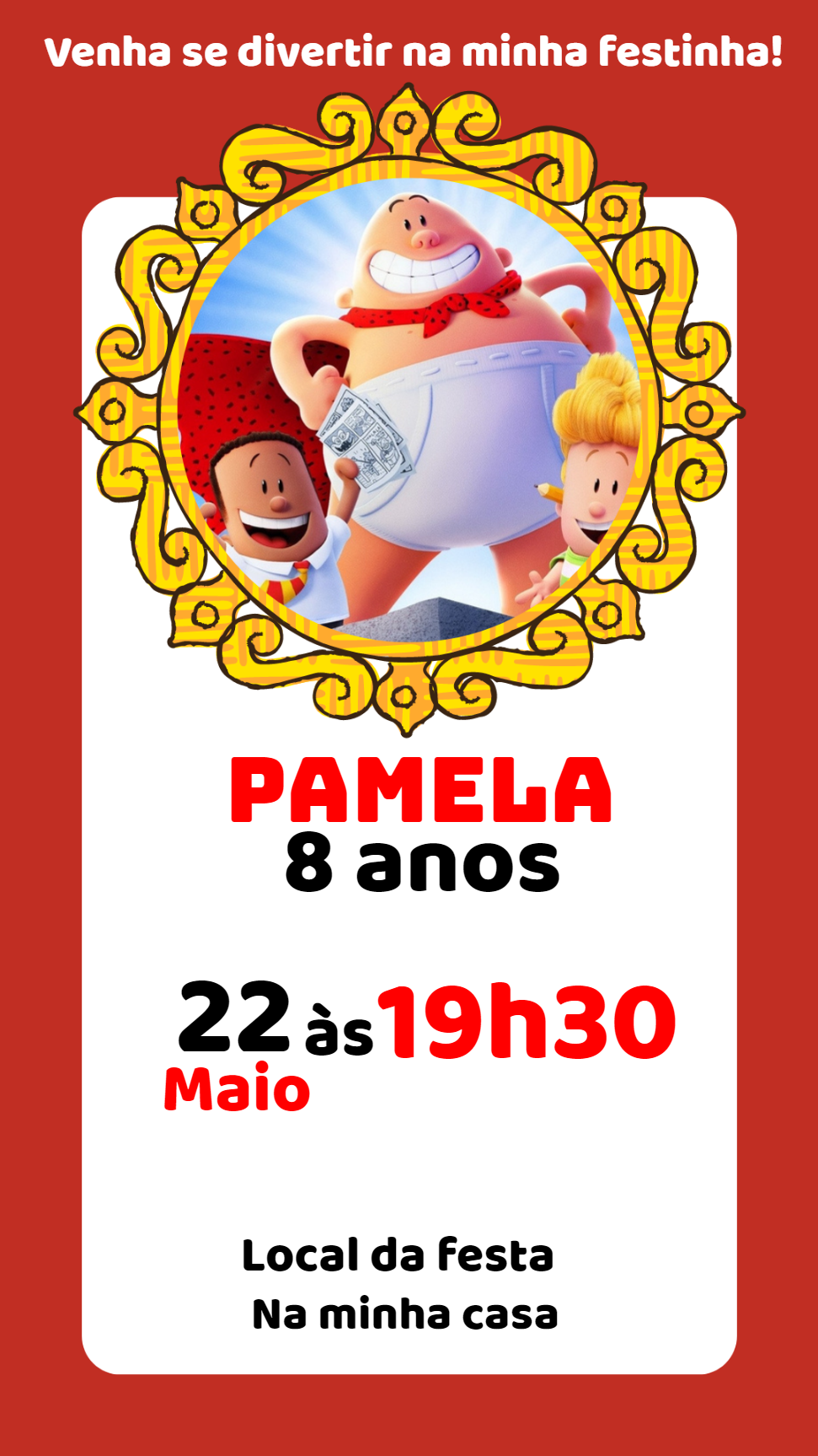 Prepare-se para uma aventura hilária e inesquecível com o nosso exclusivo Convite de Aniversário Capitão Cueca, o template perfeito para transformar a festa do seu pequeno herói em um evento épico e cheio de risadas! Este design vibrante e super divertido, com o icônico Capitão Cueca e seus amigos George e Harold, transmite uma energia contagiante e um espírito de pura alegria, ideal para celebrar os 8 anos da Pamela ou qualquer criança que adore histórias cheias de imaginação e travessuras. Personalize facilmente todos os detalhes, como a data (22 de maio), o horário (19h30) e o local ("Na minha casa"), garantindo que cada convidado sinta a emoção de "Venha se divertir na minha festinha!" e mergulhe no universo desse personagem tão amado. Com este convite digital otimizado para e-commerce, você garante praticidade e um toque de originalidade que fará a diferença, criando memórias preciosas de um dia repleto de diversão e amizade.