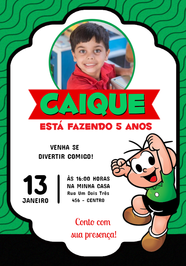 Crie um convite de aniversário personalizado com o Cebolinha! Adicione a foto do seu filho e edite todas as informações de forma fácil e rápida.