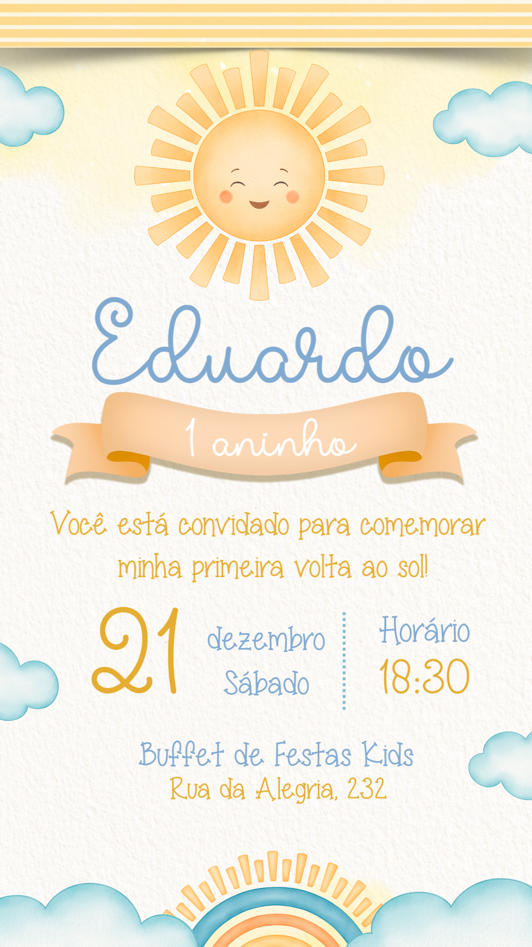 Celebre o primeiro aninho com este lindo convite do tema sol! Personalize online com os dados da festa e envie facilmente pela internet.