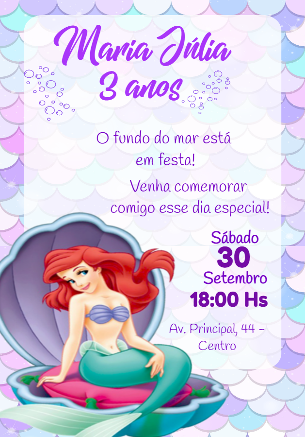 Mergulhe na magia do fundo do mar com nosso encantador Convite de Aniversário Sereia Ariel, perfeito para celebrar os 3 anos da sua pequena Maria Júlia ou qualquer outra princesa que sonha com aventuras aquáticas! Este template vibrante e festivo transmite uma alegria contagiante com suas cores pastel de escamas de sereia e a adorável Ariel, convidando a todos para uma celebração inesquecível. Ideal para festas de aniversário infantis com tema de sereia, este convite detalhado e personalizável garante que seus convidados sintam a emoção de um dia especial no reino submarino, marcando a data e o local com clareza e um toque de fantasia. Deixe a imaginação fluir e crie memórias preciosas com este design mágico que captura a essência da diversão e do encanto marinho.