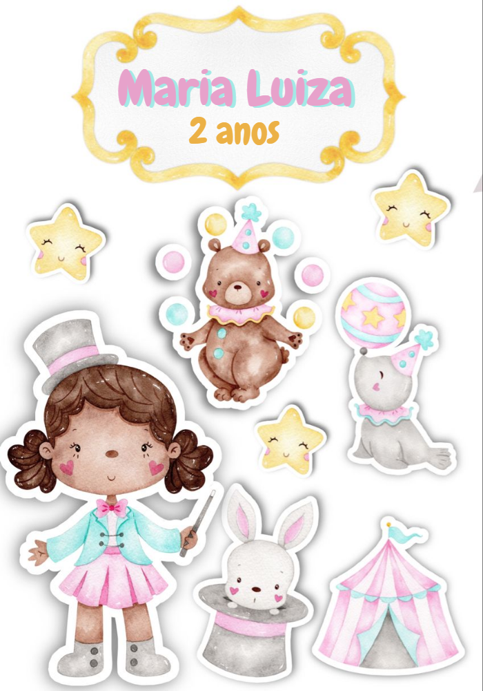 Dê um toque de magia à sua festa com este encantador topo de bolo do tema Circo Aquarela! Com ilustrações delicadas de uma menininha mágica, urso malabarista, foca, coelho na cartola e uma tenda de circo, o design é pura doçura e diversão. Ideal para aniversários, este kit é totalmente personalizável. Edite online de forma rápida e fácil, adicionando o nome e a idade do(a) aniversariante para criar uma peça exclusiva para sua celebração. A melhor parte? O download é instantâneo! Após a personalização, baixe o arquivo em alta qualidade e imprima onde preferir. Transforme o bolo da festa em uma verdadeira atração com esta decoração única e cheia de charme.
