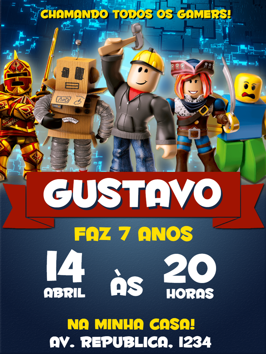Chame todos os gamers para sua festa! Personalize este convite do Roblox online com os dados do seu evento e envie para os convidados pela internet.