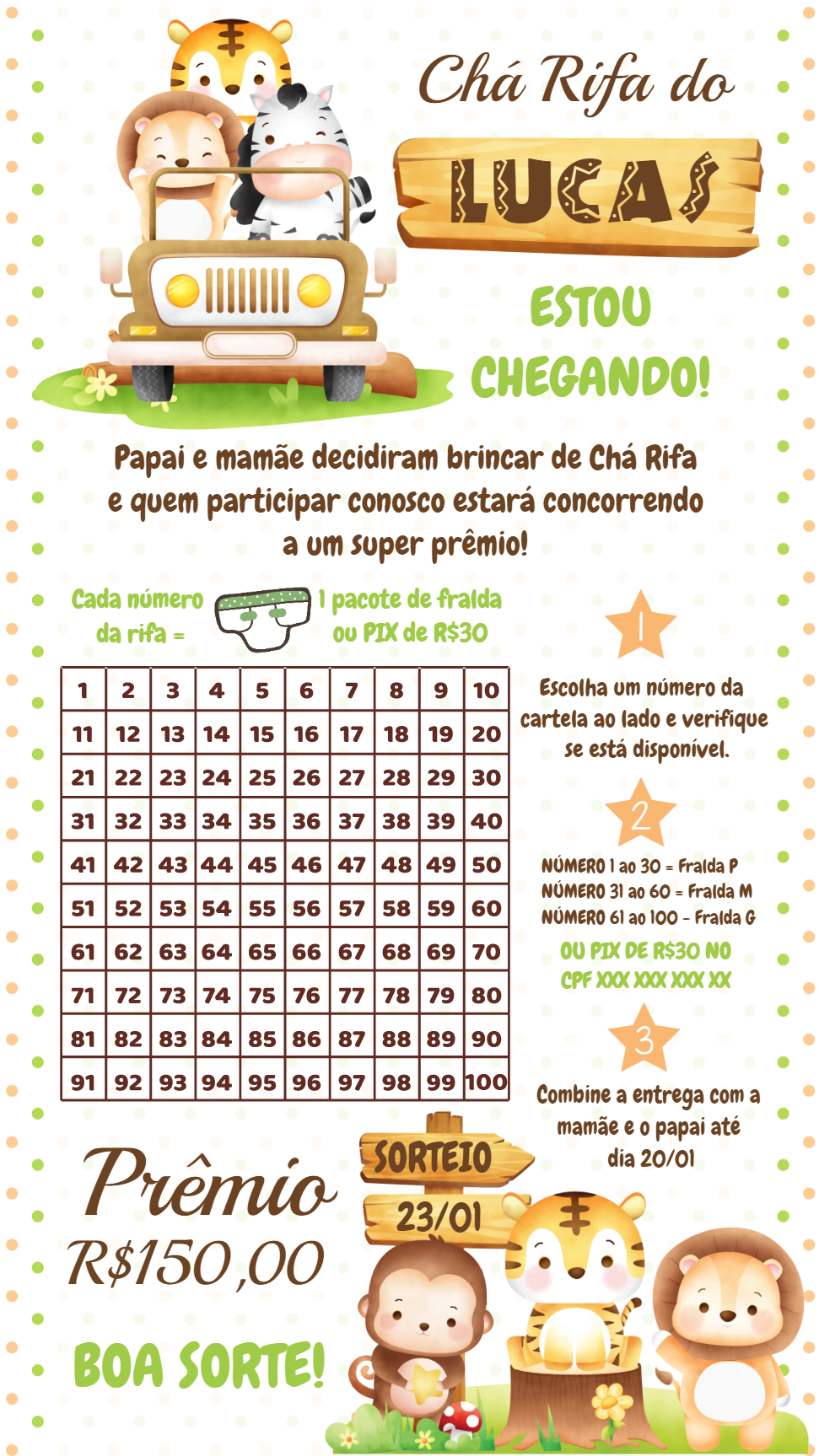 Organize um Chá Rifa de bebê inesquecível com este template editável do tema Safari! Com um design encantador de bichinhos fofos como leão, tigre e zebra, esta arte é perfeita para celebrar a chegada do seu pequeno. Personalize online de forma fácil e rápida: adicione o nome do bebê, as regras da rifa, o valor do prêmio e a data do sorteio. Tudo é 100% editável para se adaptar às suas necessidades. Após a edição, o download é imediato! Ideal para enviar pela internet, compartilhar nas redes sociais ou até mesmo imprimir. Crie agora mesmo e surpreenda seus amigos e familiares com esta forma moderna e divertida de celebrar