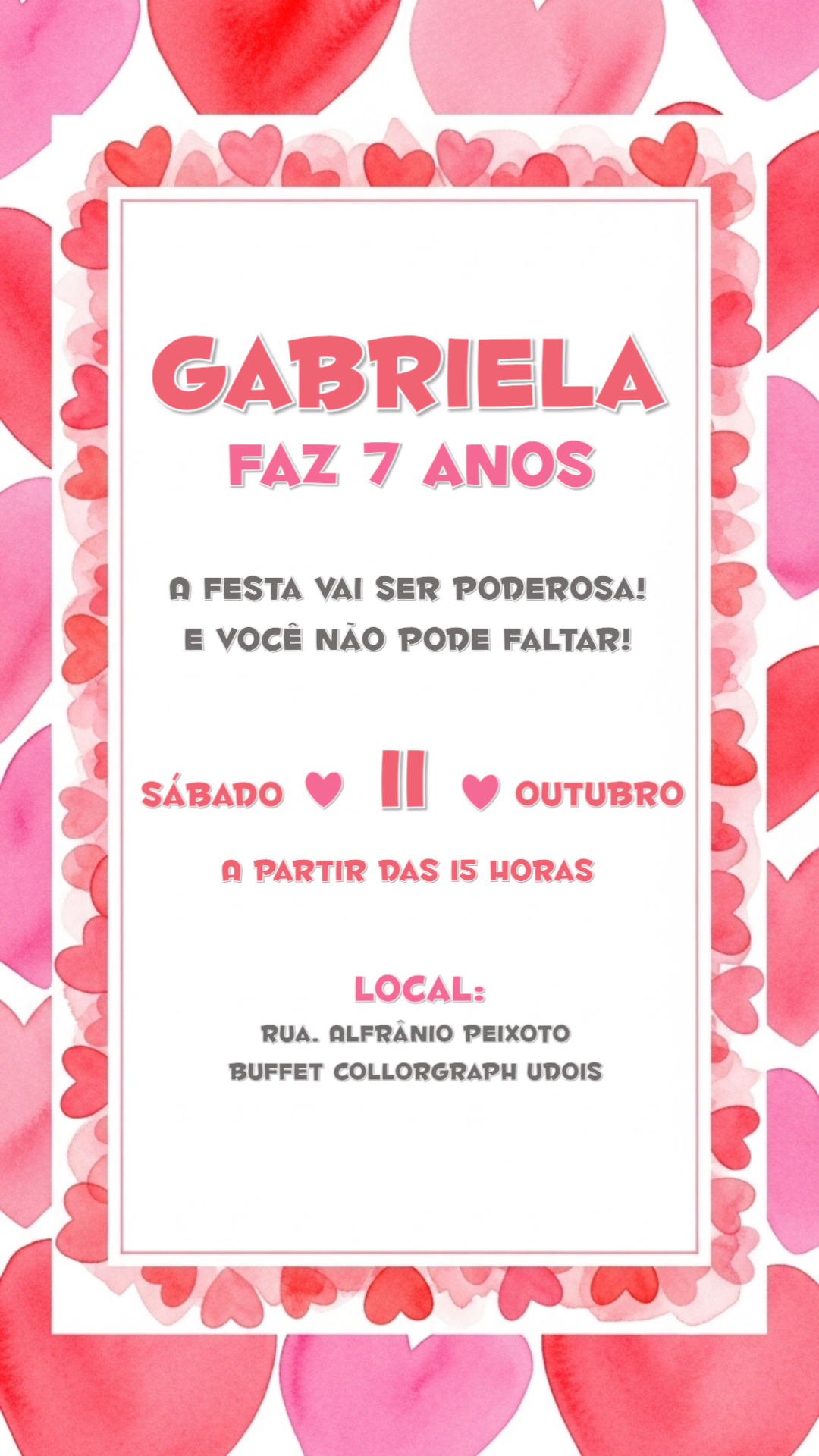 Celebre um aniversário inesquecível com este convite encantador! Com um lindo fundo de corações em aquarela nos tons de rosa e vermelho, este design é perfeito para uma festa cheia de amor e alegria. Personalize online de forma rápida e fácil! Altere o nome da aniversariante, a idade, a data, o horário e o local do evento diretamente no nosso site. Em poucos minutos, seu convite exclusivo estará pronto. Após a edição, o download é instantâneo. Você pode enviar digitalmente para seus amigos e familiares ou imprimir em alta qualidade para uma entrega especial. Crie agora e prepare-se para uma comemoração poderosa