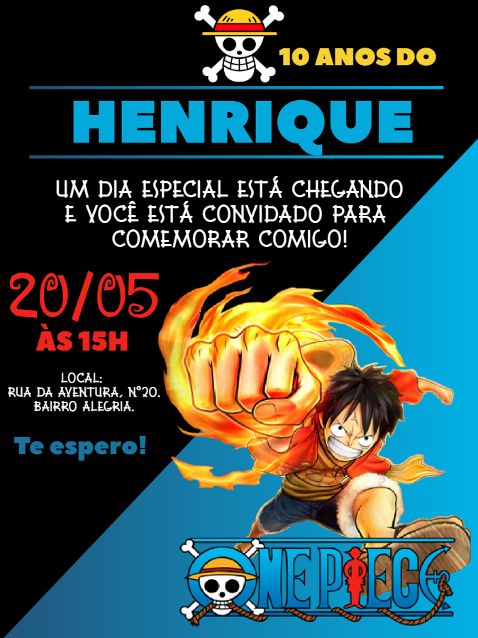 Prepare-se para uma aventura épica com este convite de aniversário temático do One Piece! Com um design vibrante e cheio de ação, estrelando Monkey D. Luffy, é a escolha perfeita para convocar sua tripulação para uma festa inesquecível. A melhor parte? Você personaliza tudo online, de forma rápida e intuitiva! Altere o nome e a idade do aniversariante, insira a data, o horário e o endereço da sua comemoração. Após finalizar a edição, o download é imediato. Crie seu convite personalizado em minutos e compartilhe facilmente pela internet com amigos e familiares ou imprima para uma entrega especial. Embarque nesta celebração