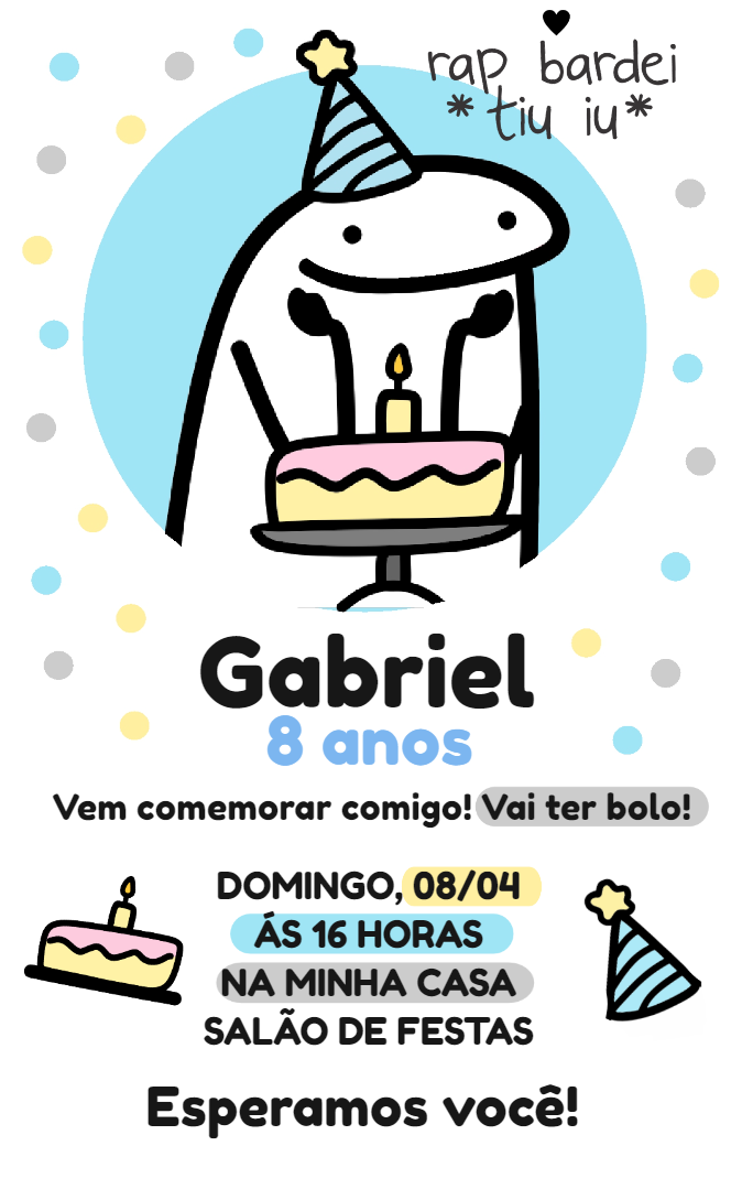 Transforme a festa do seu filho num evento super divertido com este convite de aniversário do Flork! Com o famoso meme em um design alegre com tons de azul, é a escolha perfeita para celebrar com muito bom humor. Personalize online em minutos: insira o nome do aniversariante, idade, data, horário e local da comemoração. É simples, rápido e você não precisa de nenhuma habilidade de design. Após a edição, faça o download instantaneamente e compartilhe com amigos e familiares pela internet ou imprima para uma entrega especial. Crie um convite memorável e garanta muitas risadas antes mesmo da festa começar