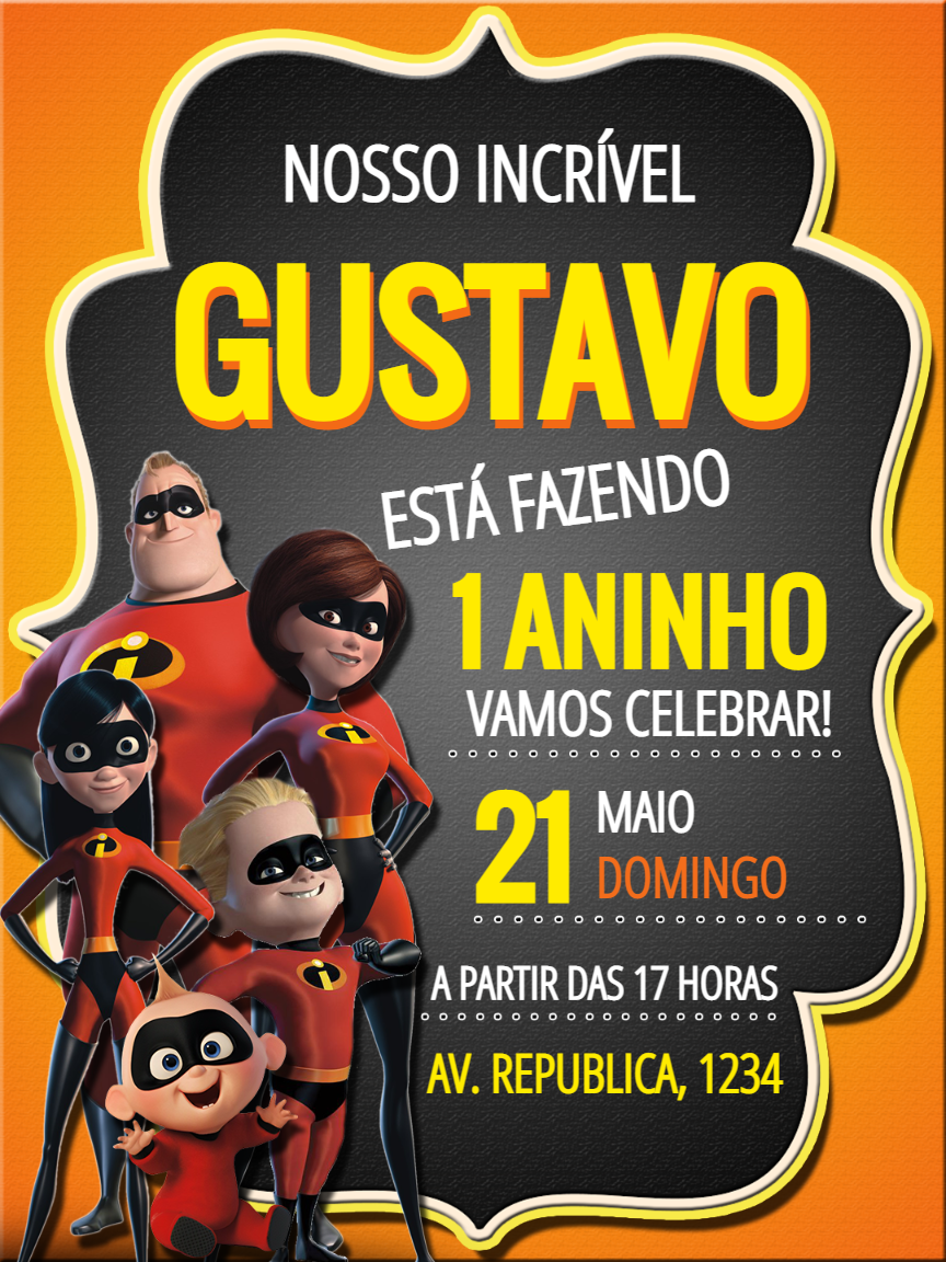 Celebre um aniversário incrível com este convite digital da família de super-heróis mais amada! Com um design dinâmico e cores vibrantes, este modelo é perfeito para uma festa cheia de ação. Personalize online em minutos: adicione o nome do aniversariante, a idade, a data, o horário e o endereço da comemoração. É super fácil e rápido! Assim que terminar, seu convite personalizado estará pronto para download imediato. Surpreenda seus convidados enviando pela internet ou imprima para uma entrega especial. Crie agora e prepare-se para uma aventura inesquecível