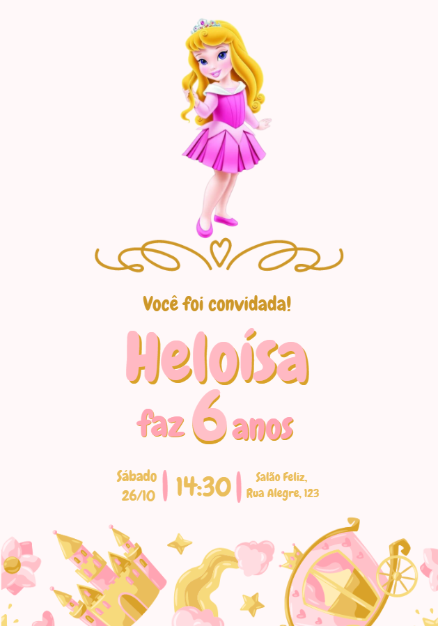 Encante seus convidados com este lindo convite da Princesa Aurora. Edite facilmente pelo celular ou computador e compartilhe pela internet!