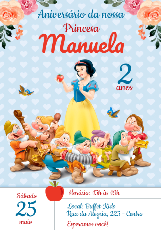 Crie um convite encantador com a Branca de Neve e os anões. Edite online com seus dados e envie para todos os convidados pela internet!
