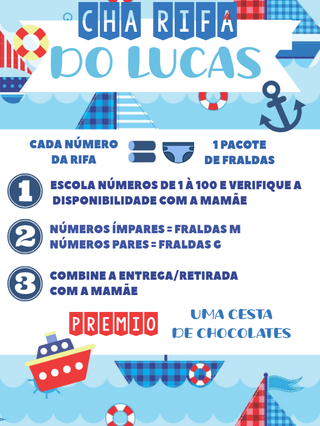 Organize um chá rifa inesquecível com este convite digital no tema marinheiro! Com um design adorável em tons de azul e vermelho, repleto de barquinhos, âncoras e boias, é a escolha perfeita para celebrar a chegada do seu pequeno. Edite online de forma fácil e rápida! Personalize com o nome do bebê, as regras da rifa, os tamanhos das fraldas e a informação sobre o prêmio. É simples e intuitivo. Após a edição, seu convite fica pronto para download imediato. Compartilhe online com seus convidados, envie pela internet ou imprima para uma recordação especial. Crie agora e prepare-se para receber muitos presentes