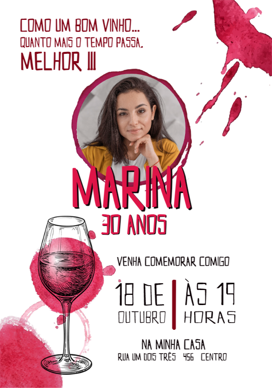 Convite Aniversário Adulto Vinho com Foto Editável Online