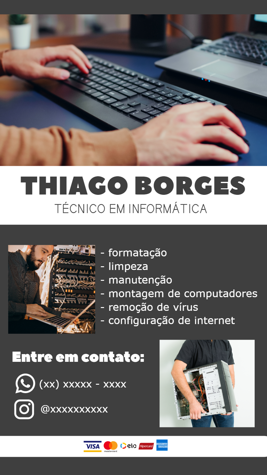 Promova seus serviços de informática com um design profissional e moderno! Este modelo de cartão de visita digital para técnico em informática é perfeito para destacar seu trabalho. O layout clean, com fotos de alta qualidade, transmite confiança e competência. Personalize tudo em minutos! Adicione seu nome, sua especialidade, a lista de serviços que oferece (como formatação, manutenção e montagem de computadores) e suas informações de contato e redes sociais. Você pode até indicar as formas de pagamento que aceita. Após editar, o download é imediato! Use sua arte para divulgar nas redes sociais, enviar por aplicativos de mensagens ou para imprimir e criar cartões físicos. Crie sua identidade visual e atraia mais clientes agora mesmo