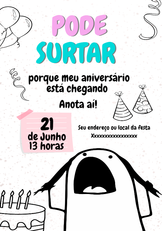 Pode surtar de alegria! Crie um convite de aniversário inesquecível com o famoso meme Flork. Este modelo divertido e moderno é perfeito para anunciar sua festa com muito humor e personalidade. Edite online de forma rápida e fácil, personalizando com o nome do aniversariante, a data, o horário e o local do evento. Após a edição, o download é instantâneo! Ideal para compartilhar nas redes sociais, enviar por aplicativos de mensagem ou até mesmo imprimir. Surpreenda seus convidados e comece a comemoração em grande estilo