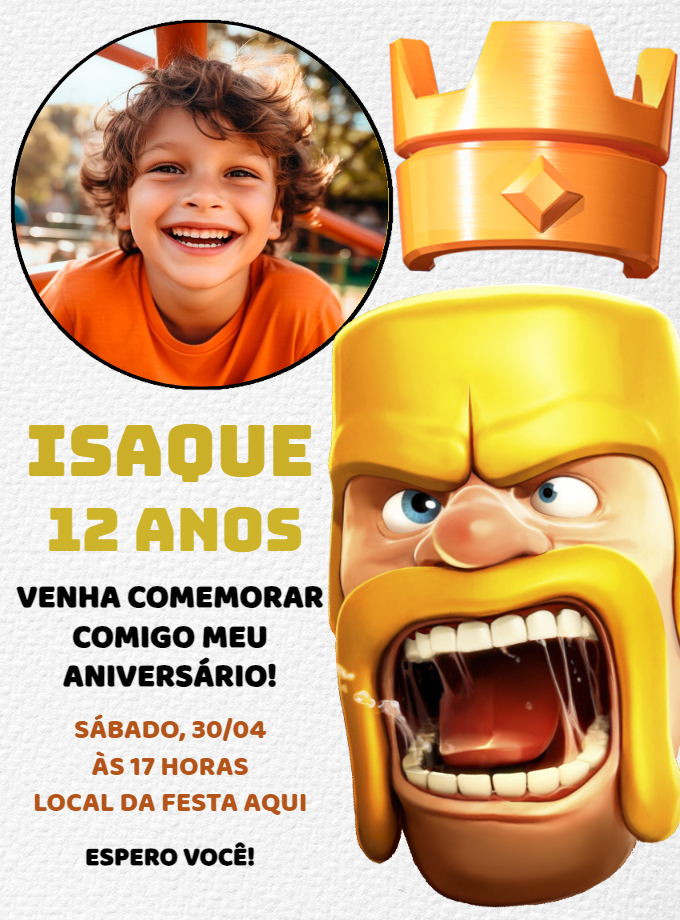 Prepare-se para uma batalha de diversão! Crie um convite de aniversário épico com o tema Clash Royale e surpreenda seus convidados. Este design vibrante, com o icônico Bárbaro e a coroa, é perfeito para a festa do seu campeão. O grande diferencial é o espaço para adicionar uma foto, tornando o convite ainda mais especial e pessoal. Edite online em poucos cliques: personalize com o nome do aniversariante, idade, data, horário e o local da comemoração. Após finalizar, o download é imediato! Envie pela internet para todos os seus amigos ou imprima em alta qualidade. Comece a planejar sua festa lendária agora mesmo