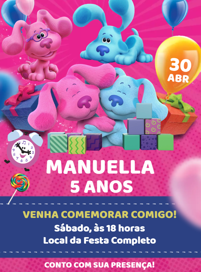 Prepare uma festa cheia de pistas e diversão com este convite de aniversário do tema As Pistas de Blue! Com um design alegre e colorido, destacando os personagens Blue e Magenta, é perfeito para celebrar um dia especial. Personalize você mesmo online em poucos minutos! Altere facilmente o nome do(a) aniversariante, a idade, a data, o horário e as informações do local. Após finalizar, seu convite fica pronto para baixar na hora. Envie para seus convidados por meios digitais ou imprima em alta qualidade para uma entrega especial. Crie um convite único e encante a todos